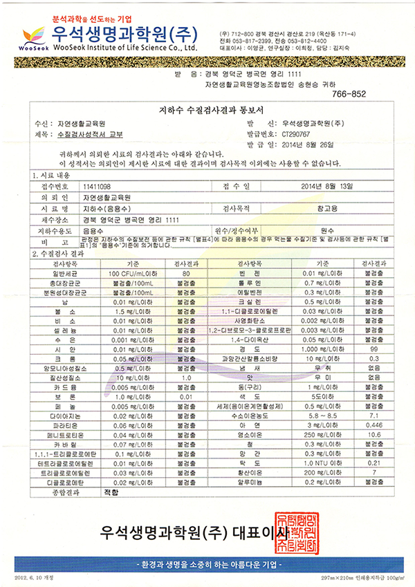 자연생활교육원의 청정지하수로 더욱 건강한 휴식을 즐기실 수 있습니다.